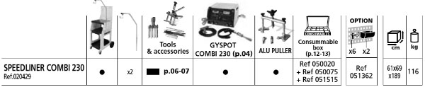Dobavljiv z: Speedliner combi 230 je celovita oprema za izvlek aluminija in jekla, s čimer bomo prihranili veliko časa. Oprema vsebuje: Aluspoter, voziček za aluspoter, potrošni material, vzvod za izvlek.